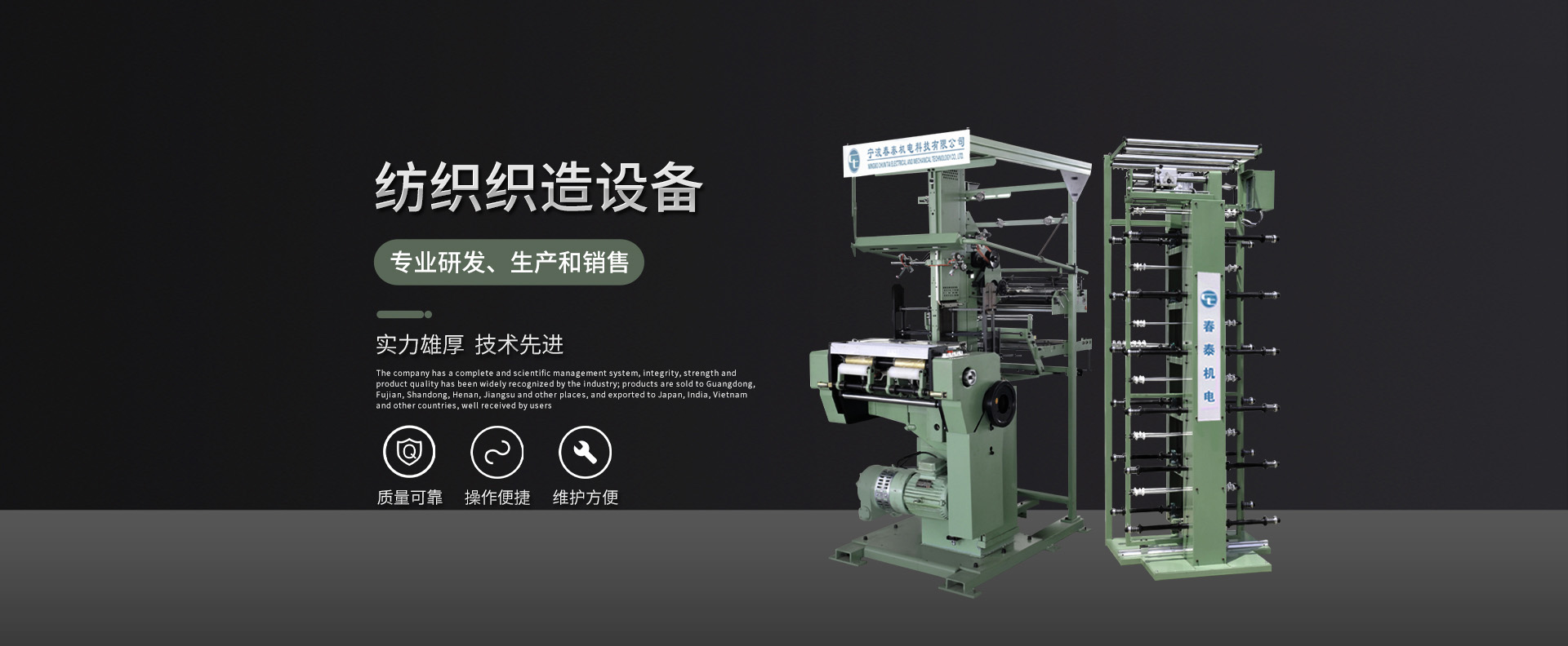 寧波春泰機電科技有限公司是一家專業從事紡織織造設備的研發、生產和銷售的科技型企業;目前公司在制產品有射出勾機生產線、高速無梭尼龍粘扣帶機、電腦提花織帶機、高速無梭織帶機、自動卷帶機等;公司技術力量雄厚,核心技術已進行知識產權保護;地處美麗的海濱城市——寧波,緊靠杭州灣跨海大橋和寧波繞城高速,交通便利;公司擁有完整、科學的管理體系,誠信、實力和產品質量獲得業界的廣泛認可;產品銷往廣東、福建、山東、河南、江蘇等地,并出口日本、印度、越南等國家,深受用戶的好評。